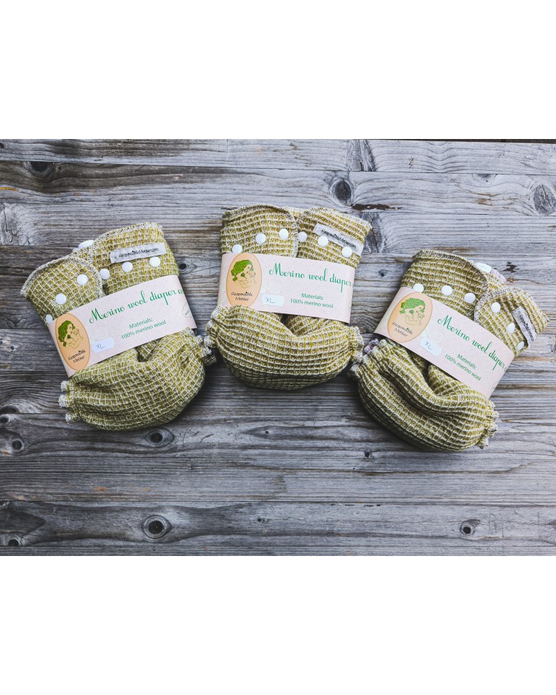 3 pcs merino wool diapers covers set XL waffle light green color, pink inside